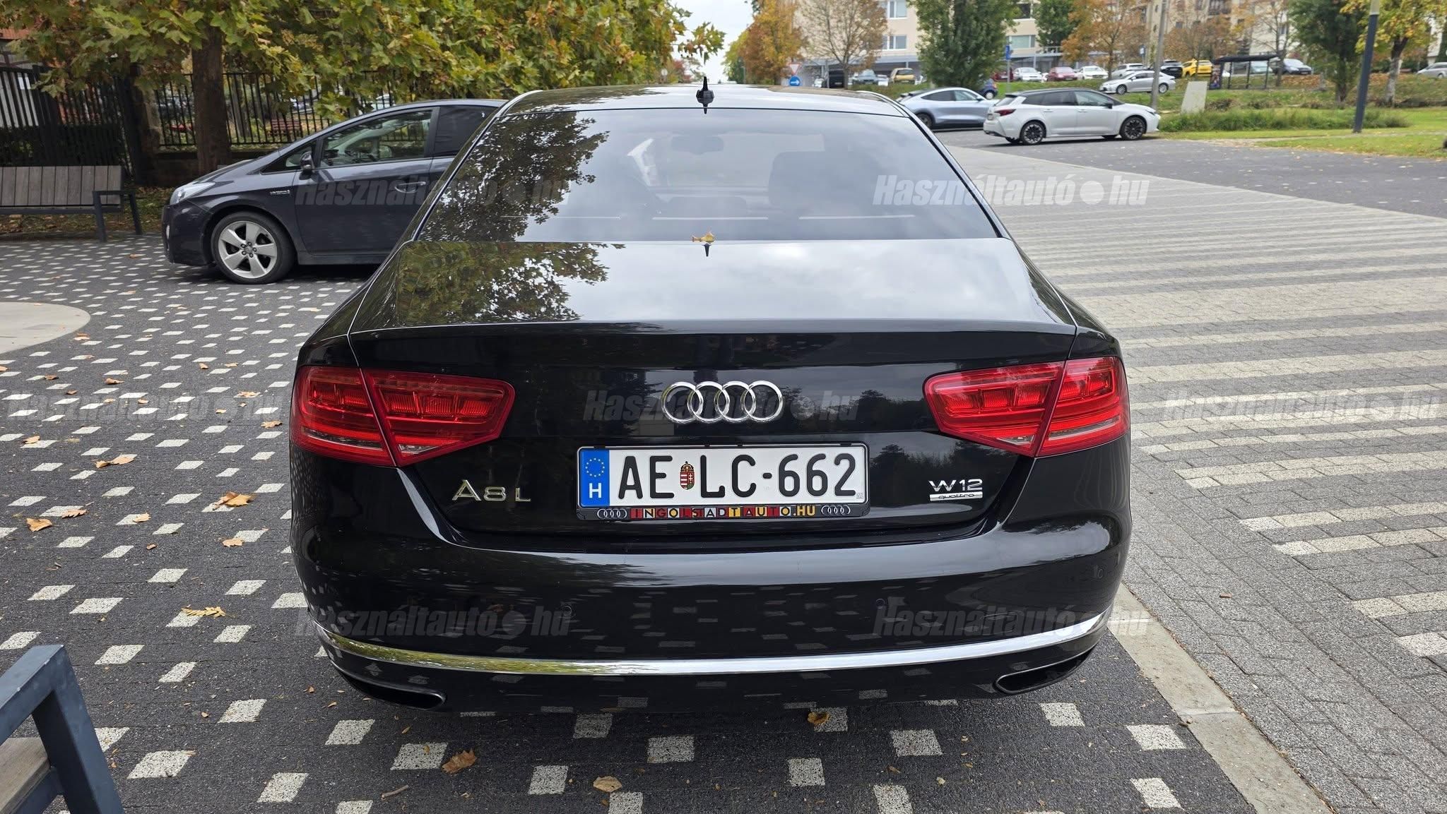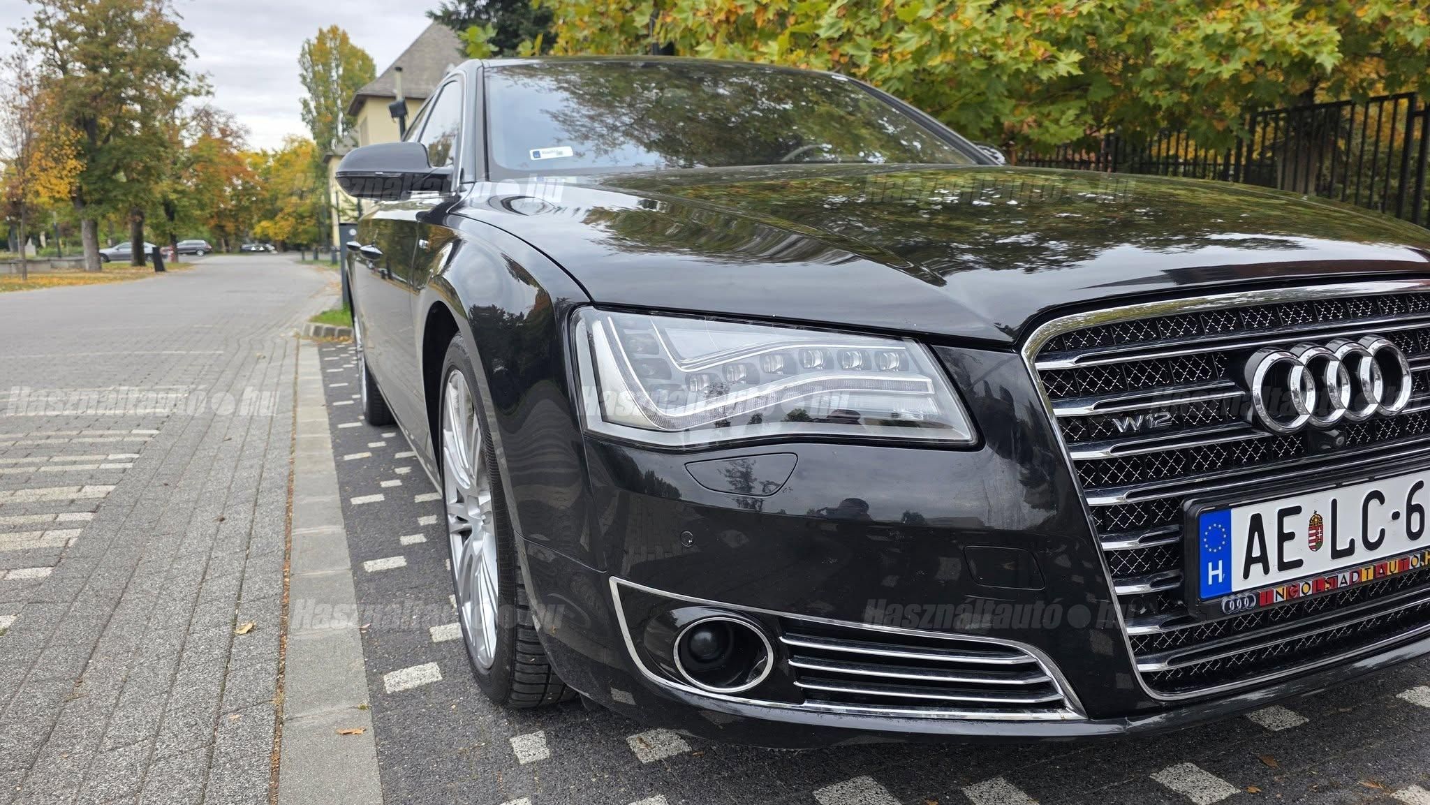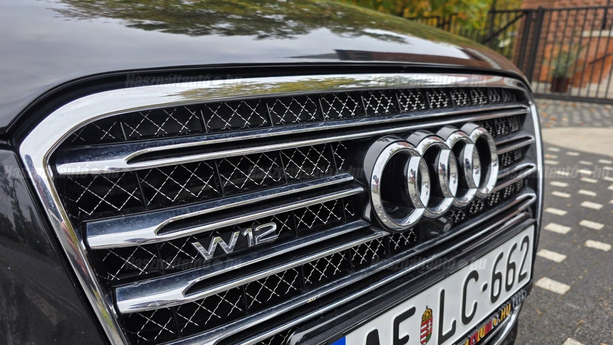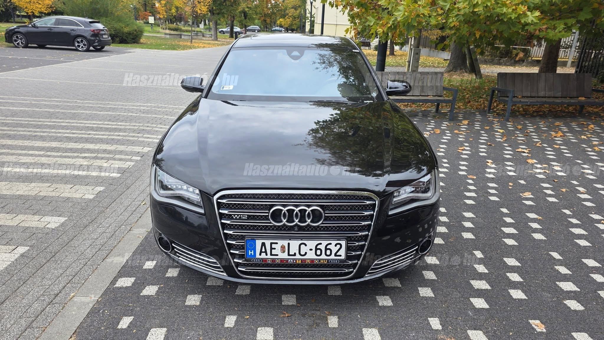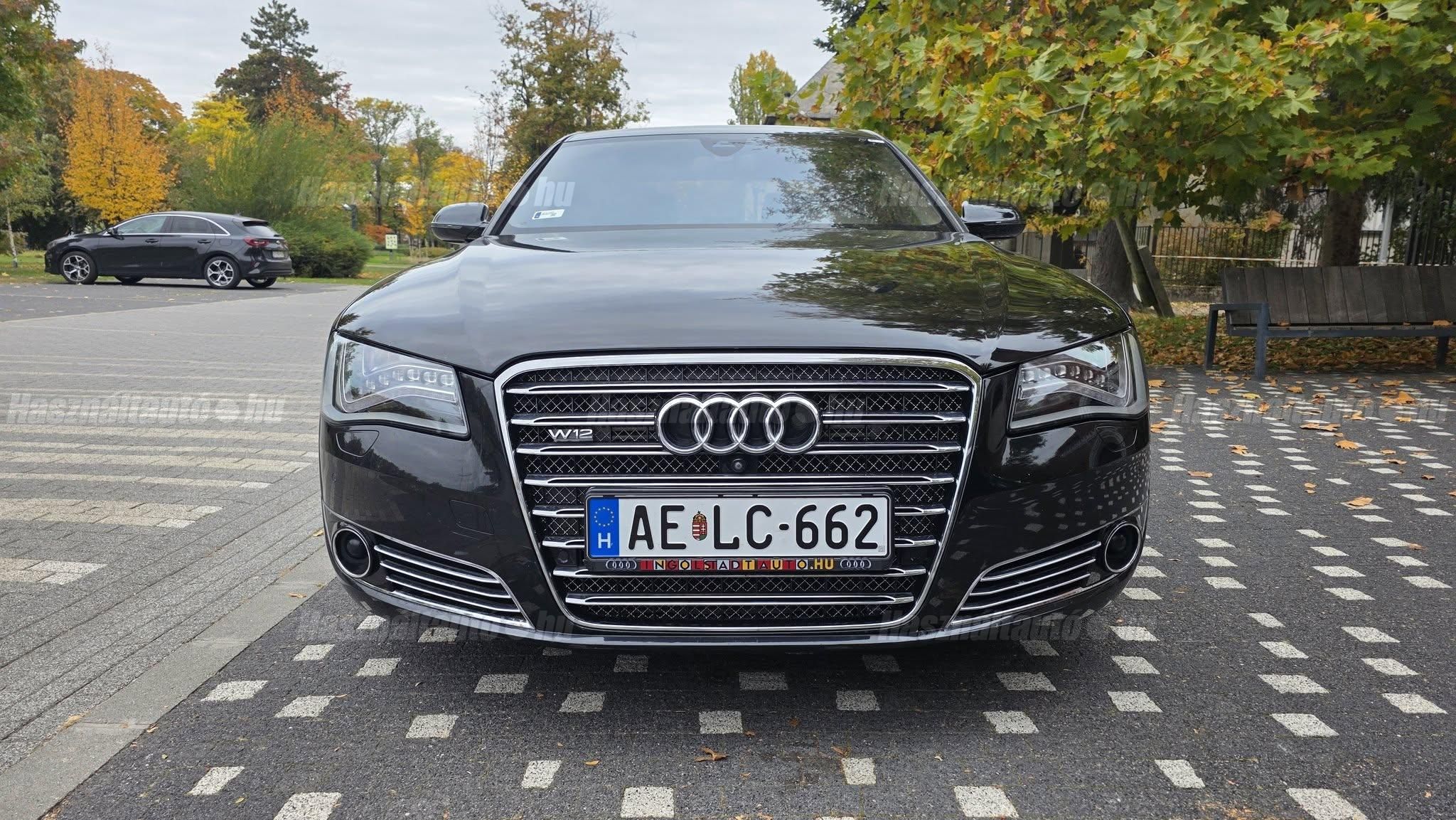 További 50 nagy felbontású kép: facebook/ingolstadtauto oldalunkon! AZ AUTÓK MEGTEKINTÉSÉHEZ MINDEN ESETBEN ELŐZETES TELEFONOS EGYEZTETÉS SZÜKSÉGES! BANKI HITELÜGYINTÉZÉSben is tudunk segíteni ez 12-84 hónapig terjedő periódusra ütemezhető. Legalább 20% önrésszel vehető fel.----------TÍPUS / ÁLLAPOT----------A TÍPUSRÓL: Egy igazán különleges A8-as került hozzánk bizományos értékesítésre, ami nem más, mint egy 6.3 literes szívó benzinmotoros W12-es kuriózum. A W12 már önmagában megér pár érdekességet, ezek között van, hogy ez a motor 2001-ben debütált, ám a D4 generációs Audi A8 már nem az eredeti hatliteres változatot, hanem annak továbbfejlesztett 6.3 literes FSI-verzióját kapta. A közvetlen befecskendezésnek köszönhetően a teljesítmény 450-ről 500 lóerőre emelkedett. Ez a 12 hengeres motor meglepően kompakt felépítésű, még a márkán belül lévő 4.2 V8-nál is kisebb. Ennek a konstrukciónak ez a legutolsó példánya, a motornak a gyártását ezután befejezték. A szokásos, jól ismert és megbízható Quattro összkerék-meghajtás természetesen itt is van, amivel biztonságosan tudunk közlekedni, legyen az bármilyen időjárási körülmény. Ebben a csúcsbenzinesben az Audi nagy váltója, a nyolcsebességes Tiptronic pakolja a fokozatokat.AZ ADOTT AUTÓRÓL: Az autó fényezése nagyon szép és homogén. A jobb oldalán történt korábban javítás, nem mérhetőek nagy értékek, ilyen 220300 mikron között, egyedül a jobb hátsó sárvédőn volt nagyobb beavatkozás, ott egy-két helyen lehet 800 mikront is mérni. A gépháztető újra lett fényezve, vélhetően kavicsfelverődés miatt. A munkák szakszerűen és igényesen készültek, szabad szemmel semmi nem utal korábbi sérülésre. Az autón történt egy kiemelkedően nagy szerviz a közelmúltban, kapott egy 50.000 km-t futott új motort, ezenkívül pedig fel lett újítva a sport differenciálműve. Az autó jelenleg költségmentes állapotban van. A felnik állapota szép, kisebb parkolási sérülések láthatók. A gumik téliek, jó állapotban vannak.A beltér tiszta, szakadás- és kopásmentes. Az autóhoz tartozik a szervizkönyv, valamint minden dokumentum, amely igazolja a futott kilométert. Minden gyári tartozék, dokumentáció, két eredeti kulcs és az állófűtés távirányítója is megvan.Szerkezetileg, motorikusan és a váltó működését tekintve is hibátlan állapotú, minden extra tökéletesen működik.----------EXTRÁK----------Elektromosan állítható első ülésekÜlésfűtés elöl-hátulÜlésszellőztetés elölElső ülések masszázs funkcióval (3 különböző mód)Ülésmemória a vezetőülésnélÜlésmemória az anyósülésnélFaberakásNapelemes napfénytetőBőrrel bevart könyöklőkBőrrel bevart ajtórekeszekSIM-kártya leolvasóKét SD-kártya foglalatHátul elektromos rolóHátsó ajtóknál felhúzható elektromos rolóÉjjellátó funkcióElektromos kormányoszlopGyári beépített telefonAlcantara betétek az ajtóbanAlcantara tetőkárpitFull LED soros fényszórókBang & Olufsen hangrendszerHolttérfigyelőElső kameraStart/Stop rendszerSRA (fényszórómosó rendszer)FékasszisztensAudi ConnectMultikormánySzínezett hővédő üvegezés (B-oszloptól hátrafelé gyári sötétítéssel)KormányváltóTávolságtartó tempomat (ACC)4 zónás digitális klímaTolatókameraBőrkormányAutomatikusan sötétedő belső tükörElöl-hátul parkolóradarEső- és fényszenzorAudi Drive Select menetdinamikai szabályozórendszer (4 alap + 1 programozható karakterisztika: váltó/motor, gázreakció, kormányzás, rugózás)Kulcsnélküli indításASR kipörgésgátlóVisszagurulás-gátlóSzínezett hátsó üvegekISOFIX gyermekülés-rögzítési pontokASR kipörgésgátlóKomfort bejutásAUTÓINKAT 1-3 ÉVIG TERJEDŐ GARANCIÁVAL IS TUDJUK ÉRTÉKESÍTENI, MEGÁLLAPODÁS SZERINT. Autóbeszámítás vagy bármilyen kérdés esetén a lenti telefonszámon keressen vagy WhatsApp-on, Viberen is elérhetőek vagyunk (email-t ne írjon!). TOVÁBBI KÜLÖNLEGES AUDIKÉRT KÖVESSE KÍNÁLATUNKAT FACEBOOKON: INGOLSTADTAUTO |
