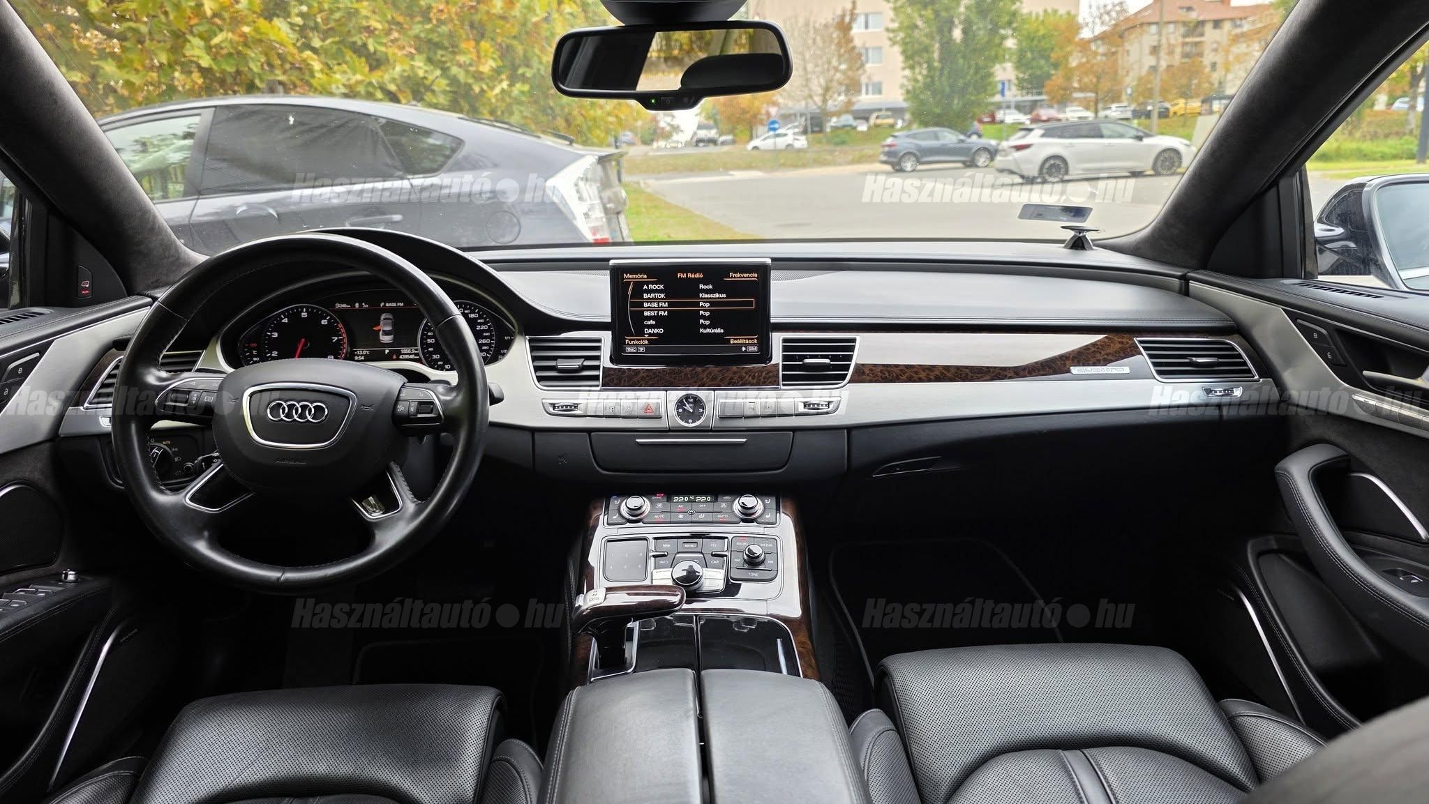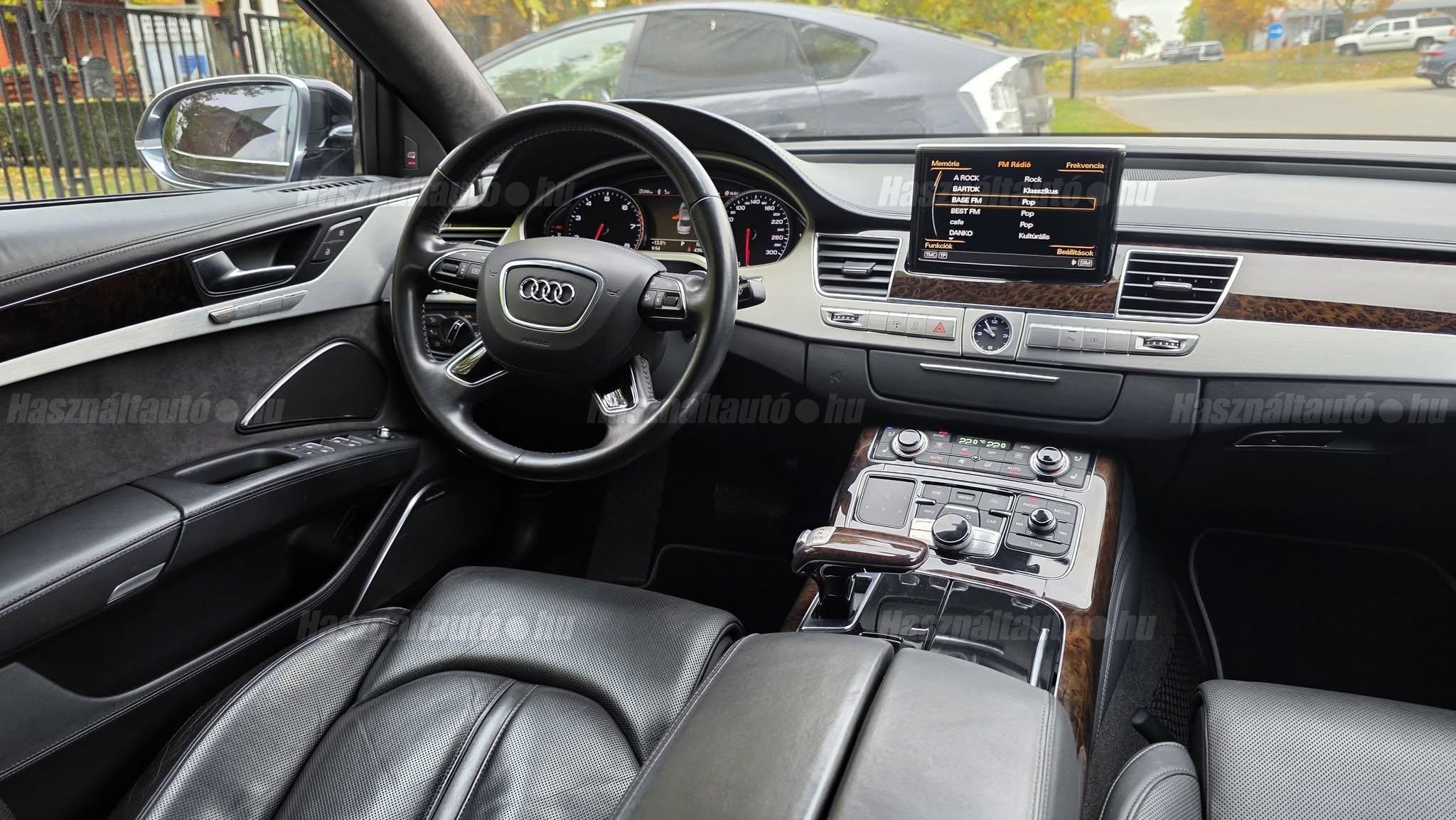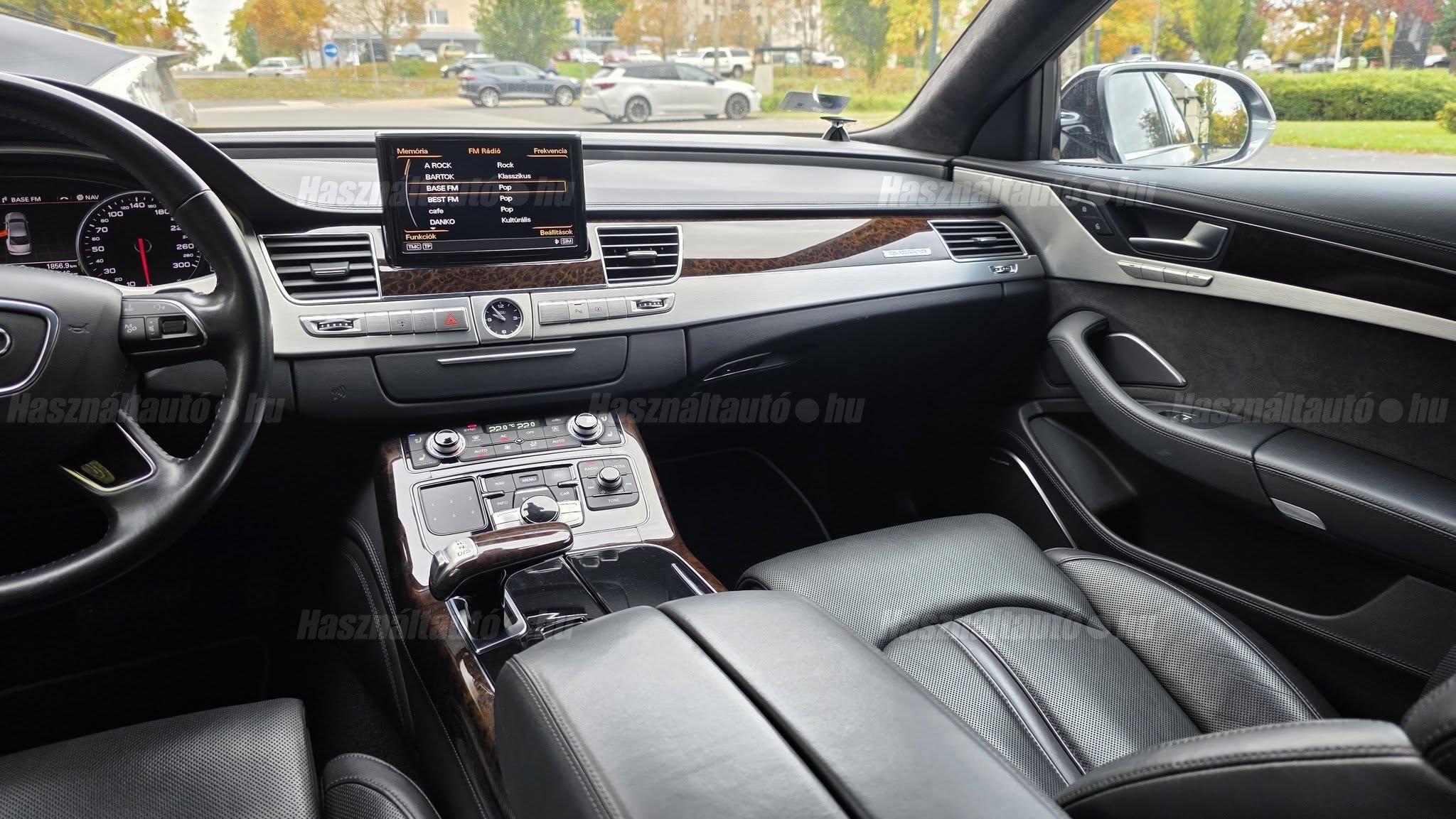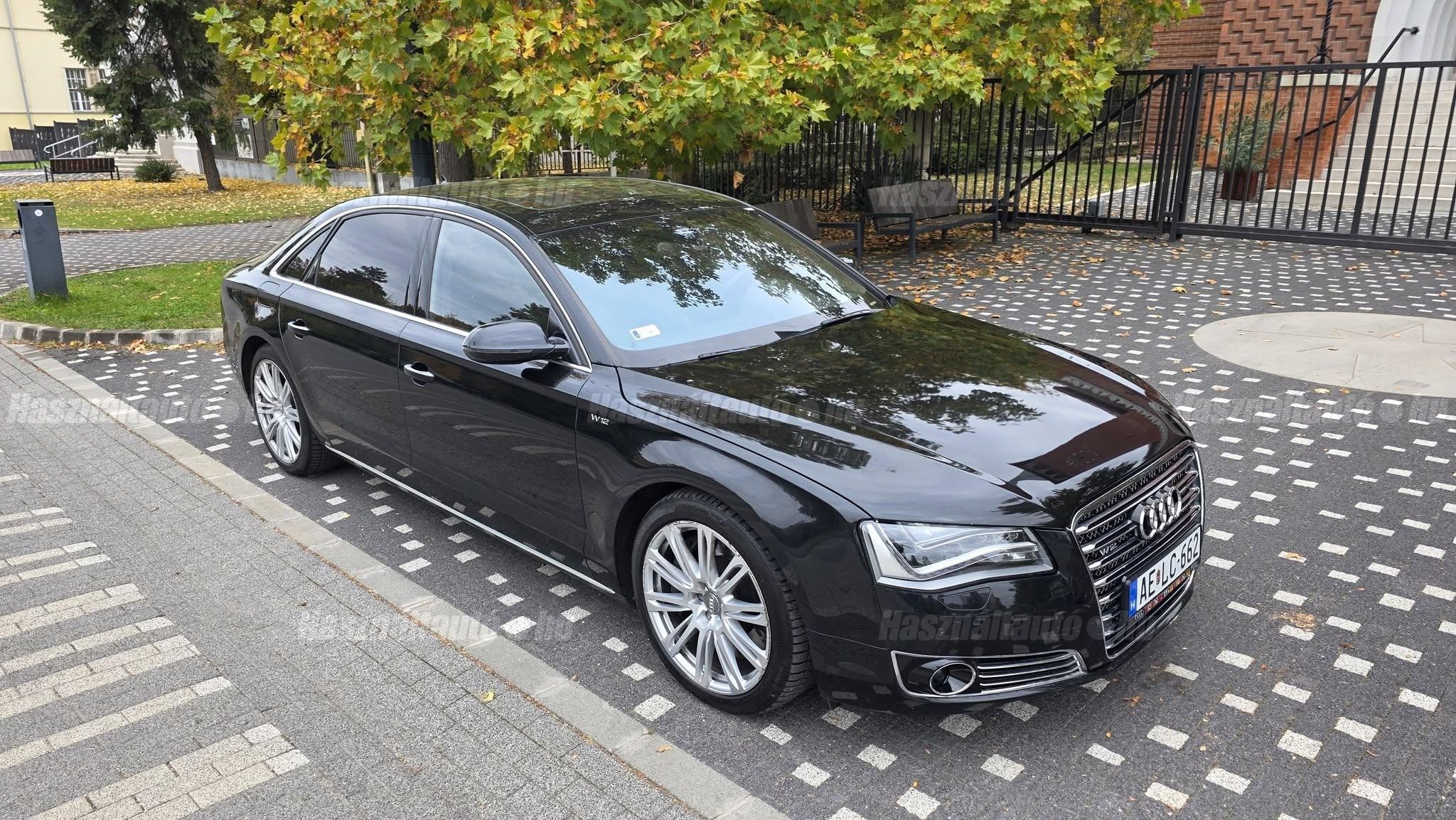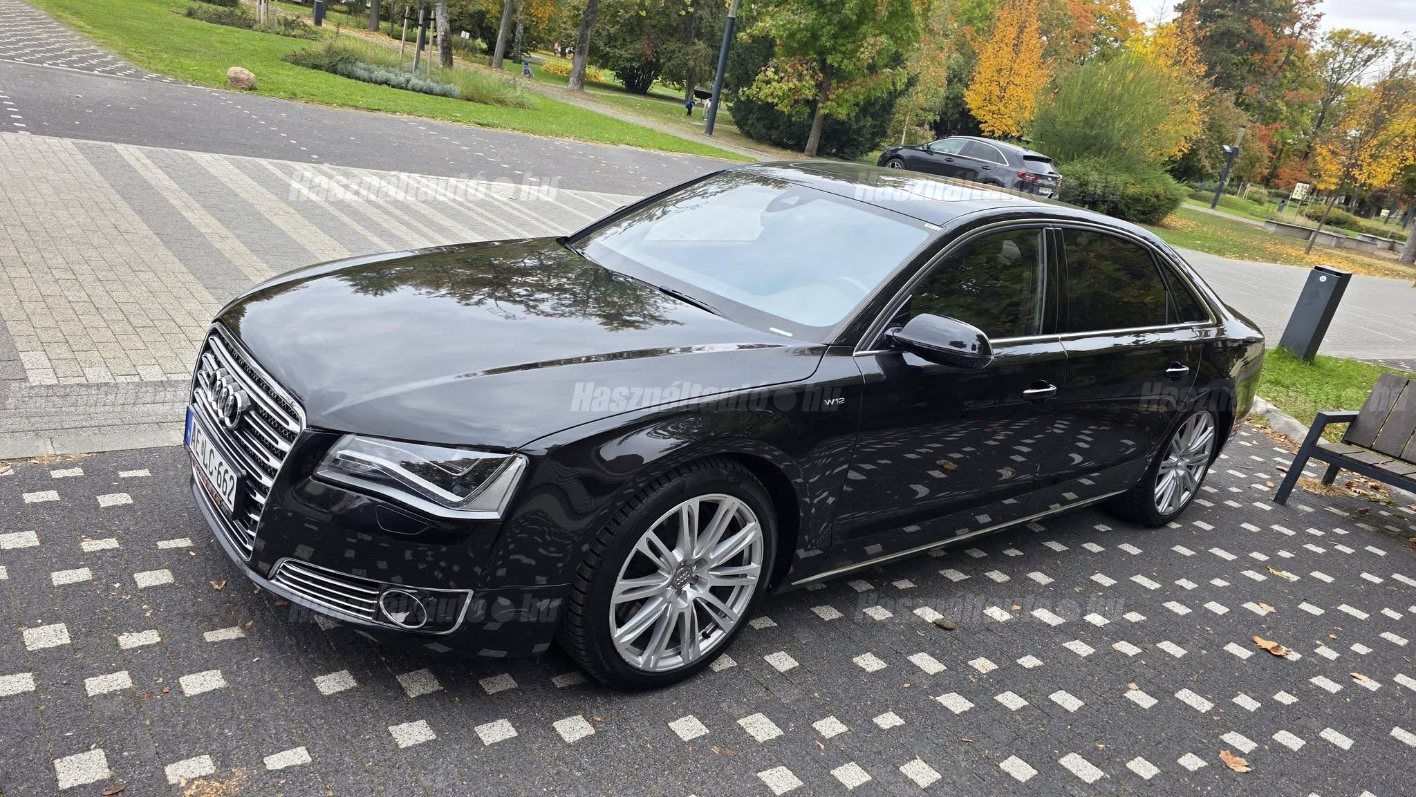 További 50 nagy felbontású kép: facebook/ingolstadtauto oldalunkon! AZ AUTÓK MEGTEKINTÉSÉHEZ MINDEN ESETBEN ELŐZETES TELEFONOS EGYEZTETÉS SZÜKSÉGES! BANKI HITELÜGYINTÉZÉSben is tudunk segíteni ez 12-84 hónapig terjedő periódusra ütemezhető. Legalább 20% önrésszel vehető fel.----------TÍPUS / ÁLLAPOT----------A TÍPUSRÓL: Egy igazán különleges A8-as került hozzánk bizományos értékesítésre, ami nem más, mint egy 6.3 literes szívó benzinmotoros W12-es kuriózum. A W12 már önmagában megér pár érdekességet, ezek között van, hogy ez a motor 2001-ben debütált, ám a D4 generációs Audi A8 már nem az eredeti hatliteres változatot, hanem annak továbbfejlesztett 6.3 literes FSI-verzióját kapta. A közvetlen befecskendezésnek köszönhetően a teljesítmény 450-ről 500 lóerőre emelkedett. Ez a 12 hengeres motor meglepően kompakt felépítésű, még a márkán belül lévő 4.2 V8-nál is kisebb. Ennek a konstrukciónak ez a legutolsó példánya, a motornak a gyártását ezután befejezték. A szokásos, jól ismert és megbízható Quattro összkerék-meghajtás természetesen itt is van, amivel biztonságosan tudunk közlekedni, legyen az bármilyen időjárási körülmény. Ebben a csúcsbenzinesben az Audi nagy váltója, a nyolcsebességes Tiptronic pakolja a fokozatokat.AZ ADOTT AUTÓRÓL: Az autó fényezése nagyon szép és homogén. A jobb oldalán történt korábban javítás, nem mérhetőek nagy értékek, ilyen 220300 mikron között, egyedül a jobb hátsó sárvédőn volt nagyobb beavatkozás, ott egy-két helyen lehet 800 mikront is mérni. A gépháztető újra lett fényezve, vélhetően kavicsfelverődés miatt. A munkák szakszerűen és igényesen készültek, szabad szemmel semmi nem utal korábbi sérülésre. Az autón történt egy kiemelkedően nagy szerviz a közelmúltban, kapott egy 50.000 km-t futott új motort, ezenkívül pedig fel lett újítva a sport differenciálműve. Az autó jelenleg költségmentes állapotban van. A felnik állapota szép, kisebb parkolási sérülések láthatók. A gumik téliek, jó állapotban vannak.A beltér tiszta, szakadás- és kopásmentes. Az autóhoz tartozik a szervizkönyv, valamint minden dokumentum, amely igazolja a futott kilométert. Minden gyári tartozék, dokumentáció, két eredeti kulcs és az állófűtés távirányítója is megvan.Szerkezetileg, motorikusan és a váltó működését tekintve is hibátlan állapotú, minden extra tökéletesen működik.----------EXTRÁK----------Elektromosan állítható első ülésekÜlésfűtés elöl-hátulÜlésszellőztetés elölElső ülések masszázs funkcióval (3 különböző mód)Ülésmemória a vezetőülésnélÜlésmemória az anyósülésnélFaberakásNapelemes napfénytetőBőrrel bevart könyöklőkBőrrel bevart ajtórekeszekSIM-kártya leolvasóKét SD-kártya foglalatHátul elektromos rolóHátsó ajtóknál felhúzható elektromos rolóÉjjellátó funkcióElektromos kormányoszlopGyári beépített telefonAlcantara betétek az ajtóbanAlcantara tetőkárpitFull LED soros fényszórókBang & Olufsen hangrendszerHolttérfigyelőElső kameraStart/Stop rendszerSRA (fényszórómosó rendszer)FékasszisztensAudi ConnectMultikormánySzínezett hővédő üvegezés (B-oszloptól hátrafelé gyári sötétítéssel)KormányváltóTávolságtartó tempomat (ACC)4 zónás digitális klímaTolatókameraBőrkormányAutomatikusan sötétedő belső tükörElöl-hátul parkolóradarEső- és fényszenzorAudi Drive Select menetdinamikai szabályozórendszer (4 alap + 1 programozható karakterisztika: váltó/motor, gázreakció, kormányzás, rugózás)Kulcsnélküli indításASR kipörgésgátlóVisszagurulás-gátlóSzínezett hátsó üvegekISOFIX gyermekülés-rögzítési pontokASR kipörgésgátlóKomfort bejutásAUTÓINKAT 1-3 ÉVIG TERJEDŐ GARANCIÁVAL IS TUDJUK ÉRTÉKESÍTENI, MEGÁLLAPODÁS SZERINT. Autóbeszámítás vagy bármilyen kérdés esetén a lenti telefonszámon keressen vagy WhatsApp-on, Viberen is elérhetőek vagyunk (email-t ne írjon!). TOVÁBBI KÜLÖNLEGES AUDIKÉRT KÖVESSE KÍNÁLATUNKAT FACEBOOKON: INGOLSTADTAUTO |