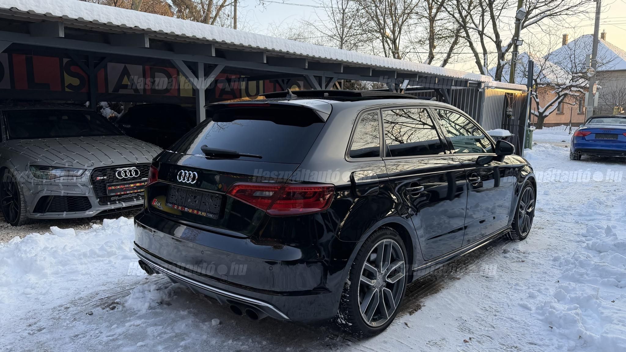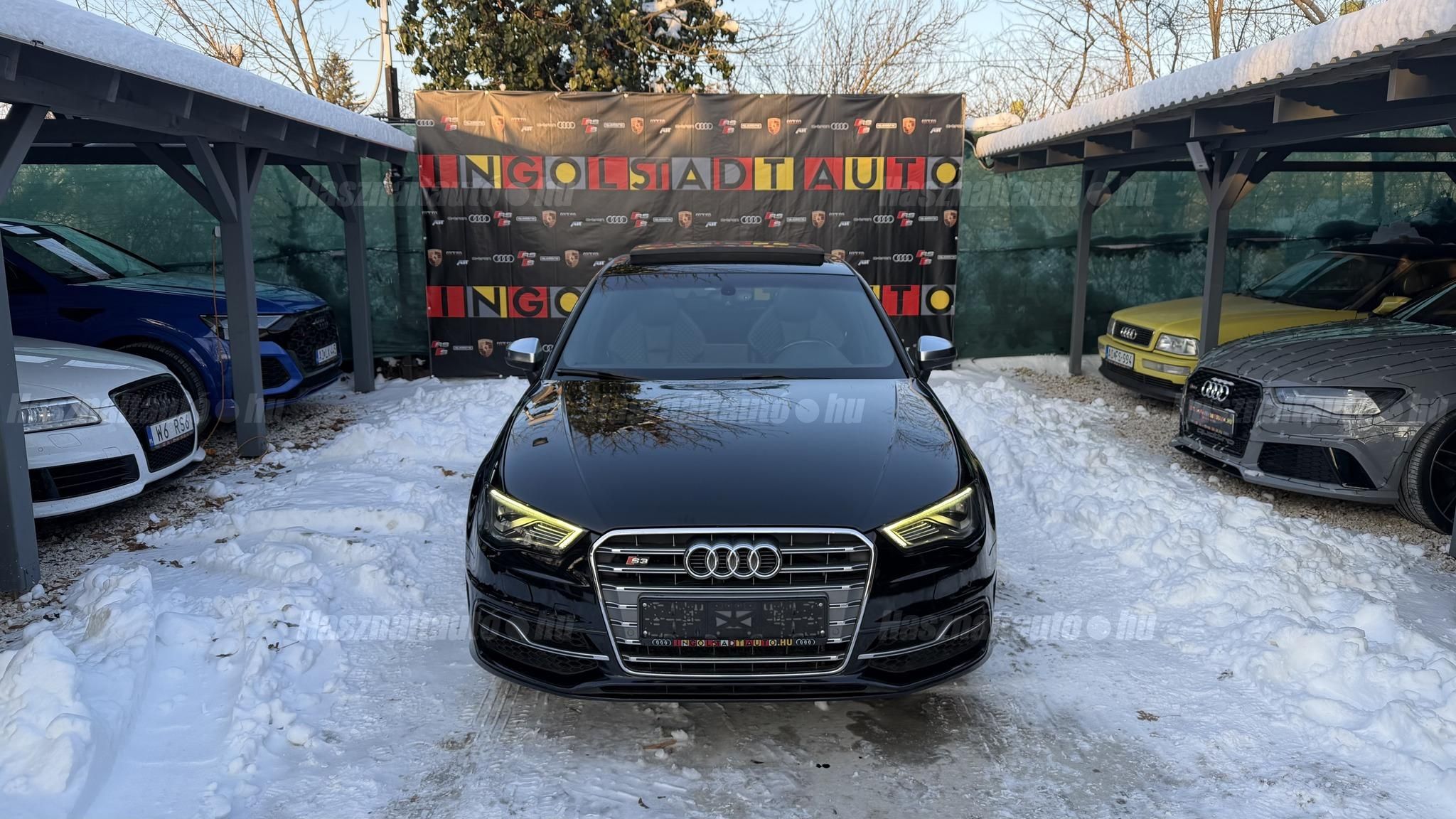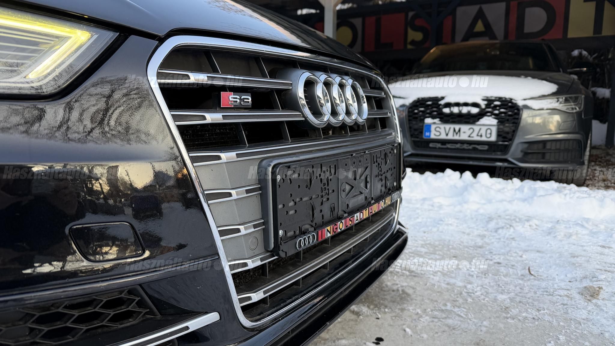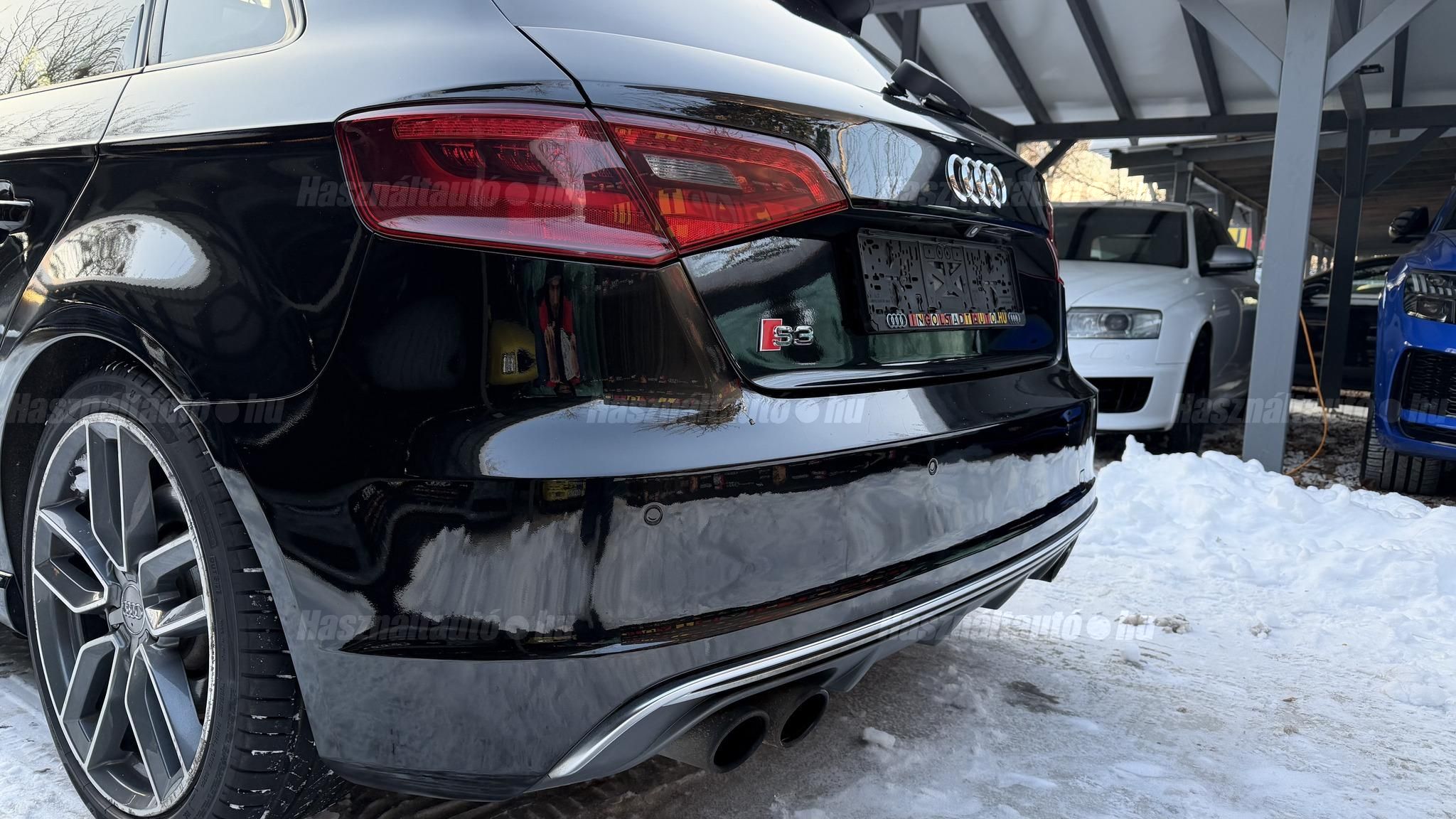 További 80 nagy felbontású kép: facebook/ingolstadtauto oldalunkon! AZ AUTÓK MEGTEKINTÉSÉHEZ MINDEN ESETBEN ELŐZETES TELEFONOS EGYEZTETÉS SZÜKSÉGES! ---------- RÉSZLET FIZETÉSSEL IS ELVIHETŐ: Nincs hitelbírálat, nem gond a BAR lista, nem kérünk jövedelemigazolást sem. Kezdő részlet: 5 millió Ft További részletek: 12 x 270.000Ft -havi részletekben egy éven át. NEM tartalmazza a kötelező biztosítás és a CASCO költségét, melyek feltételei a szerződés megkötésének. Magasabb kezdő részlet befizetése esetén a további havi részletek alcsonyabbak lehetnek. Alacsonyabb kezdő részlet befizetésére nincs lehetőség! További feltételekért és információkért keressen minket személyesen vagy telefonon. BANKI HITELÜGYINTÉZÉSben is tudunk segíteni ez 12-84 hónapig terjedő periódusra ütemezhető. Legalább 20% önrésszel vehető fel.----------TÍPUS / ÁLLAPOT----------A TÍPUSRÓL:Egy 2014-es Audi S3 Sportback egy ötajtós kompakt, amely a sportos teljesítményt a mindennapi praktikummal ötvözi. A 2,0 literes turbós TFSI motor 300 LE-t és 380 Nm-t ad le, így 0100 km/h mindössze 5 másodperc alatt futja, a quattro összkerékhajtás és a sportfutómű precíz és biztonságos vezetést bíztosít legyen az bármilyen időjárási körülmény. Az S tronic váltó gyors kapcsolásai és kényelmes működése tovább fokozza a sportos vezetési élményt.AZ ADOTT AUTÓRÓL:Szép Mythos Black színű Sportback. Az autó fényezése szép és homogén. Az autó rongálásból kifolyólag körbe volt fújva, a festékvastagság 300 mikronnál sehol sem több. A javítási munka hibátlan minőségben lett rajta elvégezve. A gyári 18 colos Audi felnik állapota padkanyomos, felújításra szorulnak, ezeknek a kijavítása benne van az árban. 2023-as nyári gumik állapota jó. Beltere megkímélt, kopás-, karc- és kiülésmentes. Szerkezetileg és motorikusan hibátlan, minden extra tökéletesen működik. Minden tartozék, gyári dokumentáció, végig vezetett szervizkönyv és 2 db eredeti kulcs rendelkezésre áll.----------EXTRÁK----------Kipörgésgátló rendszer (ASR)Belső kárpitozás: prémium nappa bőrEasy-Entry beszállás megkönnyített hozzáférésDupla napellenzőBelső felszerelés: Alumínium befejezés / megjelenésAdaptív féklámpaCsomagtér takaró / SötétítőElektromechanikus kézifékFékrendszer visszanyerési rendszerrelLED irányjelzők az oldaltükrökben integrálvaFűthető hátsó ablak(ok)Bejárati küszöbök alumínium bevonattal és logóvalMotor 2.0 Ltr. - 221 kW 16V TFSIDohányos csomagTároló- és csomagtartó csomagCsomag: AmbícióTextil mennyezeti kárpitozás, feketeAkusztikus üveg szélvédőFejtámlák hátul (3 pozíció)Dugasz (12V csatlakozás) az elülső középső konzolbanPótkerék, mint vészkerekKarosszéria: 4 ajtóElső ülések kihúzható combtámasszalÁllítható magasságú első ülésekKörnyezetvédelmi rendszer Euro 6 szabványBelső: Kibővített mono. pur felszerelésBelső felszerelés: Betétek 3D fekete bevonattal/aspektussalKerék lopásgátló (Zárak felül elhelyezve)Audi connect (alap internet szolgáltatás)Világítási csomagHangrendszer Bang & OlufsenBelső visszapillantó tükör automatikus vakításgátló rendszerrelMegfordítható csomagtér szönyegMegvilágított sminktükörHátsó ablakok sötétítettekKönnyűfém keréktárcsák 7,5x18 (5 párhuzamos küllő, Részben polírozott)Gumikontroll mutatóGuminyomás-ellenőrző rendszerLED vetítőLED hátsó lámpákFékerősítőOsztható/hajtható hátsó ülésdőElülső középső kartámaszZöld színű atermikus üvegKözponti zár távirányítássalFény- és esőérzékelőTetőspoilerElektromosan állítható, fűthető és behajtható külső visszapillantó tükörAszférikus külső tükör, balKonvex külső tükrök, jobbKülső tükör karosszériaszínbenSebességszabályozó rendszer (tempomat)Kristály hatású festékStart/Stop rendszer6 sebességes váltó - duplakuplungos S-tronic sbességváltóKormánykerék (sport bőr - 3 küllős)Fényszóró-mosó rendszer (fényszóró mosó)Fényszóró-mosó rendszer (fényszóró mosó)Audi Drive SelectAlváz/felfüggesztések szabályozott lengéscsillapítással (Magnetic Ride)Isofix rögzítések gyermeküléshezVezetéstámogató rendszer: Távolsági fényszóró asszisztensVezetési asszisztens: Utasvédelmi rendszer (Audi pre sense basic)Nappali menetjelző lámpákZáró-/indítórendszer Speciális kulcs (Kényelmi kulcs-Comfort Key)AUTÓINKAT 1-3 ÉVIG TERJEDŐ GARANCIÁVAL IS TUDJUK ÉRTÉKESÍTENI, MEGÁLLAPODÁS SZERINT. Autóbeszámítás vagy bármilyen kérdés esetén a lenti telefonszámon keressen vagy WhatsApp-on, Viberen is elérhetőek vagyunk (email-t ne írjon!). TOVÁBBI KÜLÖNLEGES AUDIKÉRT KÖVESSE KÍNÁLATUNKAT FACEBOOKON: INGOLSTADTAUTO |