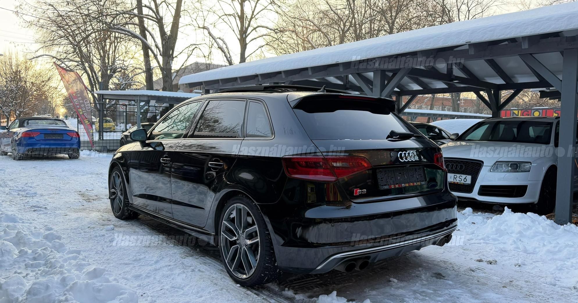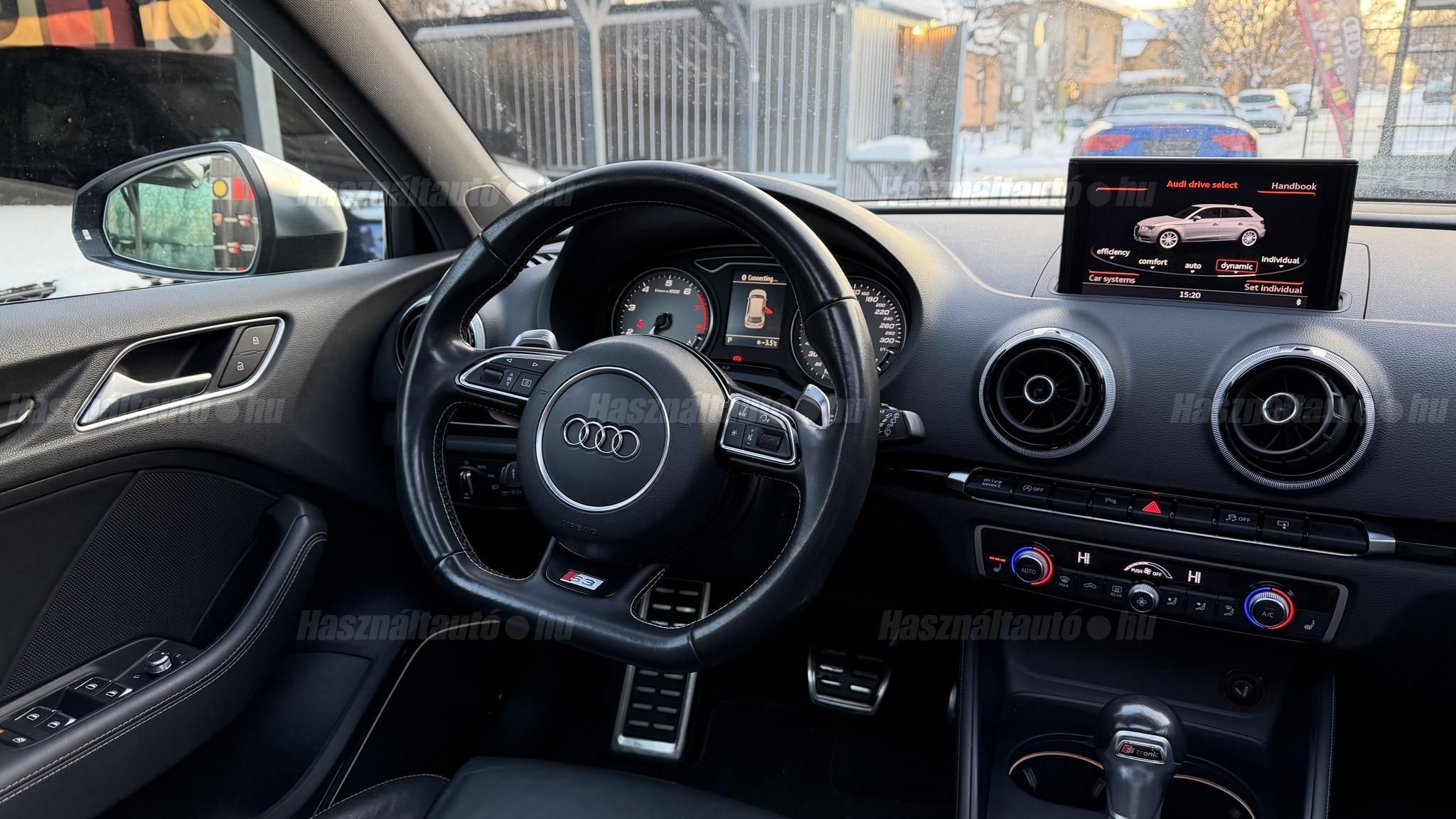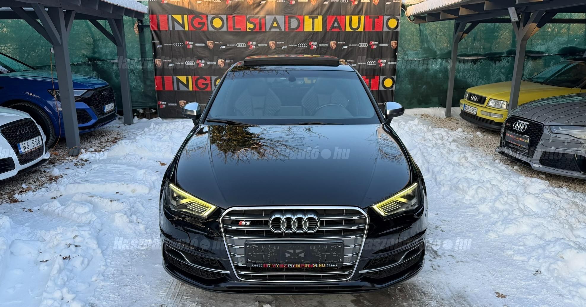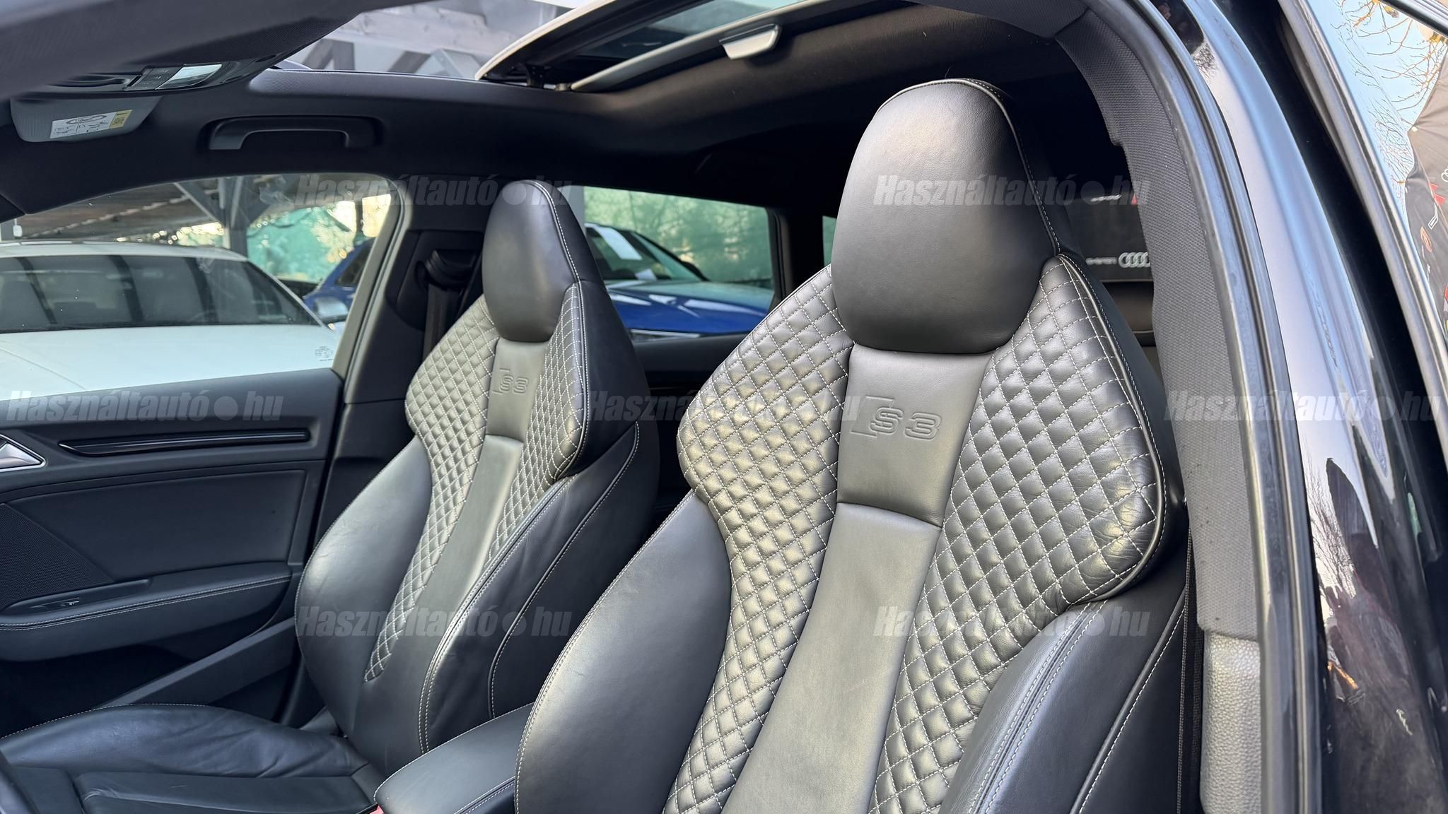 További 80 nagy felbontású kép: facebook/ingolstadtauto oldalunkon! AZ AUTÓK MEGTEKINTÉSÉHEZ MINDEN ESETBEN ELŐZETES TELEFONOS EGYEZTETÉS SZÜKSÉGES! ---------- RÉSZLET FIZETÉSSEL IS ELVIHETŐ: Nincs hitelbírálat, nem gond a BAR lista, nem kérünk jövedelemigazolást sem. Kezdő részlet: 5 millió Ft További részletek: 12 x 270.000Ft -havi részletekben egy éven át. NEM tartalmazza a kötelező biztosítás és a CASCO költségét, melyek feltételei a szerződés megkötésének. Magasabb kezdő részlet befizetése esetén a további havi részletek alcsonyabbak lehetnek. Alacsonyabb kezdő részlet befizetésére nincs lehetőség! További feltételekért és információkért keressen minket személyesen vagy telefonon. BANKI HITELÜGYINTÉZÉSben is tudunk segíteni ez 12-84 hónapig terjedő periódusra ütemezhető. Legalább 20% önrésszel vehető fel.----------TÍPUS / ÁLLAPOT----------A TÍPUSRÓL:Egy 2014-es Audi S3 Sportback egy ötajtós kompakt, amely a sportos teljesítményt a mindennapi praktikummal ötvözi. A 2,0 literes turbós TFSI motor 300 LE-t és 380 Nm-t ad le, így 0100 km/h mindössze 5 másodperc alatt futja, a quattro összkerékhajtás és a sportfutómű precíz és biztonságos vezetést bíztosít legyen az bármilyen időjárási körülmény. Az S tronic váltó gyors kapcsolásai és kényelmes működése tovább fokozza a sportos vezetési élményt.AZ ADOTT AUTÓRÓL:Szép Mythos Black színű Sportback. Az autó fényezése szép és homogén. Az autó rongálásból kifolyólag körbe volt fújva, a festékvastagság 300 mikronnál sehol sem több. A javítási munka hibátlan minőségben lett rajta elvégezve. A gyári 18 colos Audi felnik állapota padkanyomos, felújításra szorulnak, ezeknek a kijavítása benne van az árban. 2023-as nyári gumik állapota jó. Beltere megkímélt, kopás-, karc- és kiülésmentes. Szerkezetileg és motorikusan hibátlan, minden extra tökéletesen működik. Minden tartozék, gyári dokumentáció, végig vezetett szervizkönyv és 2 db eredeti kulcs rendelkezésre áll.----------EXTRÁK----------Kipörgésgátló rendszer (ASR)Belső kárpitozás: prémium nappa bőrEasy-Entry beszállás megkönnyített hozzáférésDupla napellenzőBelső felszerelés: Alumínium befejezés / megjelenésAdaptív féklámpaCsomagtér takaró / SötétítőElektromechanikus kézifékFékrendszer visszanyerési rendszerrelLED irányjelzők az oldaltükrökben integrálvaFűthető hátsó ablak(ok)Bejárati küszöbök alumínium bevonattal és logóvalMotor 2.0 Ltr. - 221 kW 16V TFSIDohányos csomagTároló- és csomagtartó csomagCsomag: AmbícióTextil mennyezeti kárpitozás, feketeAkusztikus üveg szélvédőFejtámlák hátul (3 pozíció)Dugasz (12V csatlakozás) az elülső középső konzolbanPótkerék, mint vészkerekKarosszéria: 4 ajtóElső ülések kihúzható combtámasszalÁllítható magasságú első ülésekKörnyezetvédelmi rendszer Euro 6 szabványBelső: Kibővített mono. pur felszerelésBelső felszerelés: Betétek 3D fekete bevonattal/aspektussalKerék lopásgátló (Zárak felül elhelyezve)Audi connect (alap internet szolgáltatás)Világítási csomagHangrendszer Bang & OlufsenBelső visszapillantó tükör automatikus vakításgátló rendszerrelMegfordítható csomagtér szönyegMegvilágított sminktükörHátsó ablakok sötétítettekKönnyűfém keréktárcsák 7,5x18 (5 párhuzamos küllő, Részben polírozott)Gumikontroll mutatóGuminyomás-ellenőrző rendszerLED vetítőLED hátsó lámpákFékerősítőOsztható/hajtható hátsó ülésdőElülső középső kartámaszZöld színű atermikus üvegKözponti zár távirányítássalFény- és esőérzékelőTetőspoilerElektromosan állítható, fűthető és behajtható külső visszapillantó tükörAszférikus külső tükör, balKonvex külső tükrök, jobbKülső tükör karosszériaszínbenSebességszabályozó rendszer (tempomat)Kristály hatású festékStart/Stop rendszer6 sebességes váltó - duplakuplungos S-tronic sbességváltóKormánykerék (sport bőr - 3 küllős)Fényszóró-mosó rendszer (fényszóró mosó)Fényszóró-mosó rendszer (fényszóró mosó)Audi Drive SelectAlváz/felfüggesztések szabályozott lengéscsillapítással (Magnetic Ride)Isofix rögzítések gyermeküléshezVezetéstámogató rendszer: Távolsági fényszóró asszisztensVezetési asszisztens: Utasvédelmi rendszer (Audi pre sense basic)Nappali menetjelző lámpákZáró-/indítórendszer Speciális kulcs (Kényelmi kulcs-Comfort Key)AUTÓINKAT 1-3 ÉVIG TERJEDŐ GARANCIÁVAL IS TUDJUK ÉRTÉKESÍTENI, MEGÁLLAPODÁS SZERINT. Autóbeszámítás vagy bármilyen kérdés esetén a lenti telefonszámon keressen vagy WhatsApp-on, Viberen is elérhetőek vagyunk (email-t ne írjon!). TOVÁBBI KÜLÖNLEGES AUDIKÉRT KÖVESSE KÍNÁLATUNKAT FACEBOOKON: INGOLSTADTAUTO |
